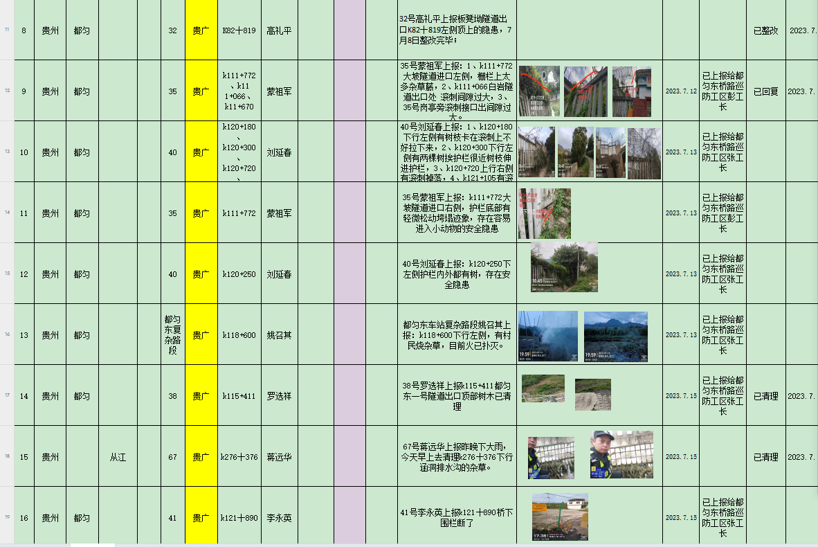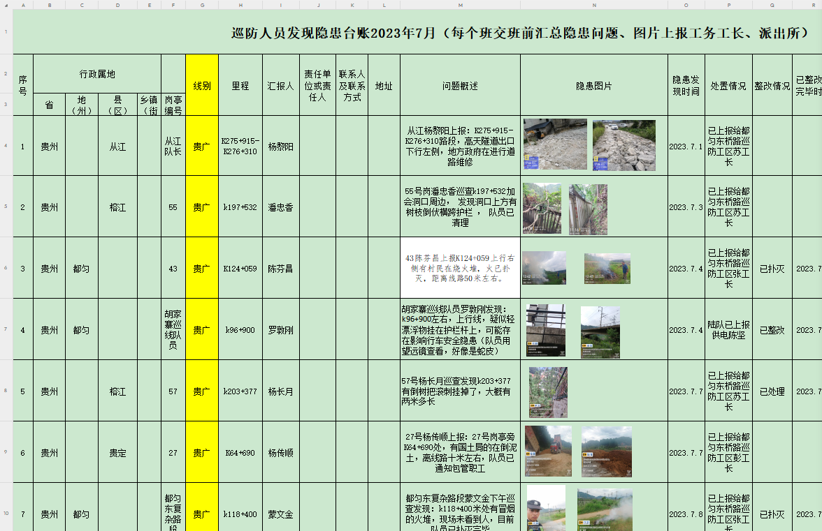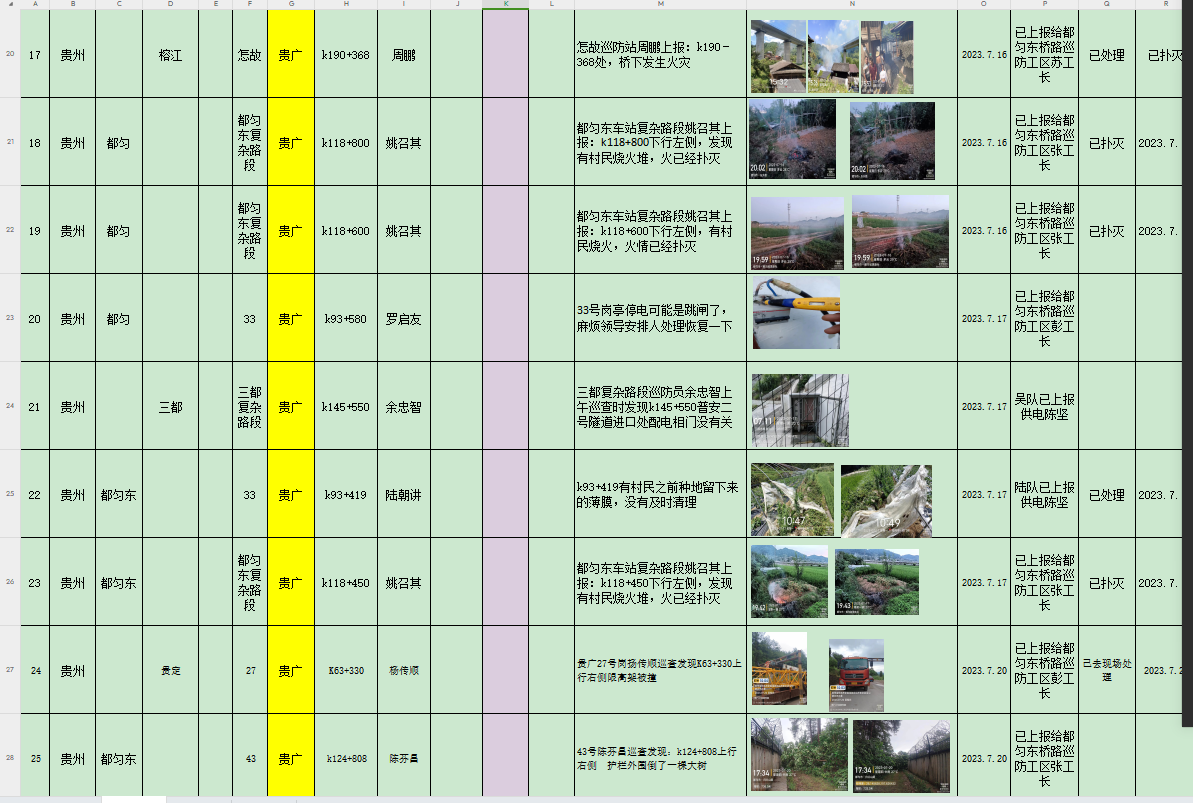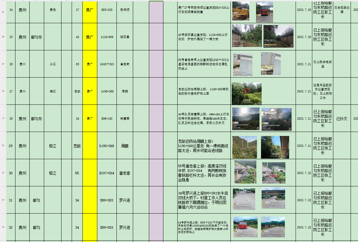 自7月以来,按照工务要求,根据公司安排和领导部署,对都匀东桥路车间所管辖的贵广客专线巡防人员的工作全面展开,对于铁路巡防安保工作的要求也是更加的严格,从上到下提高安保警惕意识,加大常态化巡防排查,严格按照高铁工务段对铁路巡防工作的相关指导要求,严格按照合同协议约定,结合线路实际情况,严格落实队员加大力度开展线路巡防安全巡查,对防洪期间进行针对性卡控及巡查。