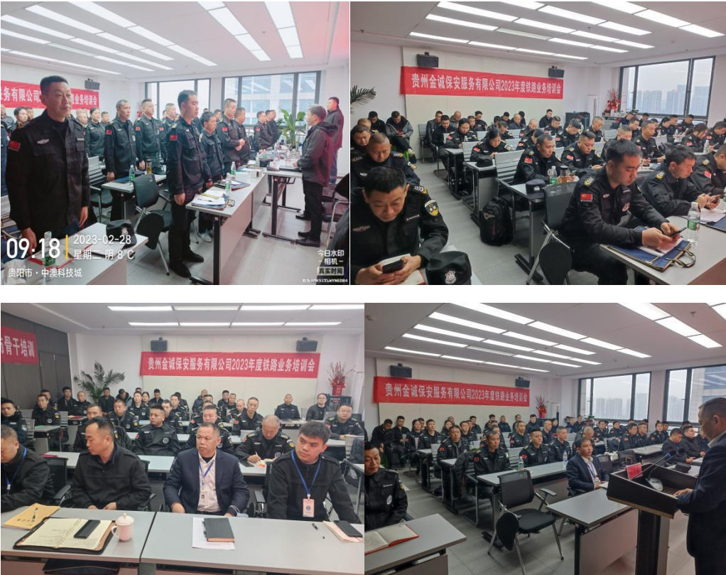 一年之际在于春,春天是播种的季节,播种希望,收获未来。为贯彻成都铁路局集团有限公司各工(电)务段及公司“安全第一、预防为主、综合治理”的安全生产方针,实现安全生产、文明生产;加强和提高铁路安保人员的综合素质、思想服务意识和业务技能,打造良好的企业形象,贵州金诚保安服务有限公司于 2023 年 2 月 28 日至 3 月 2 日组织全省各区域驻点经理及队长到公司总部(贵阳市观山湖区西部研发基地 3 号楼22 层)参加 2023 年度铁路业务技能培训会。按照培训计划,公司还邀请了贵阳高铁工务段保卫科及职教科,贵阳工务段保卫科等相关人员进行了专业业务知识培训。在各单位及公司领导的大力支持下,参训员工积极参与,培训会取得圆满成功并收到良好效果。