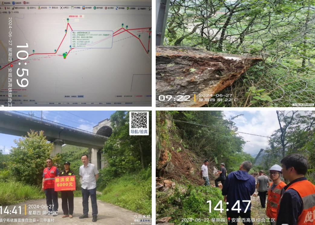 6月27日巡防队员王顺珍早上巡线时在9:05分(附巡线图左图)行走路径右上方听到有落石滚动异响,便及时往K1917+607三甲隧道出口上方前往查看,发现三甲隧道口上方山坡处有一处明显的缺口迹象,于9:23到达K1917+607隧道口右上方,发现有落石(约20多吨)滚落在被动网,致被动网变形,落石在距离三甲隧道出口上方约30米位置(附现场拍摄图右图)。巡防队员王顺珍发现这一情况后,从现场判断并不直接影响列车,但是巡防队员也不能保证落石是否会压断被动网而掉落到隧道口上方。但是巡防队员果断9:23分第一时间在现场进行拨打299手持机,后9:24分左右后拨打028-*****,在 9:26分拨打0851-*****电话,9:27分拨打车间领导电话及安顺工区工长纪星宇电话,9:28分并汇报至片区经理及队长。汇报完毕后队员第一时间再现场安全的位置进行看守,并等至工务抢险人员到来。