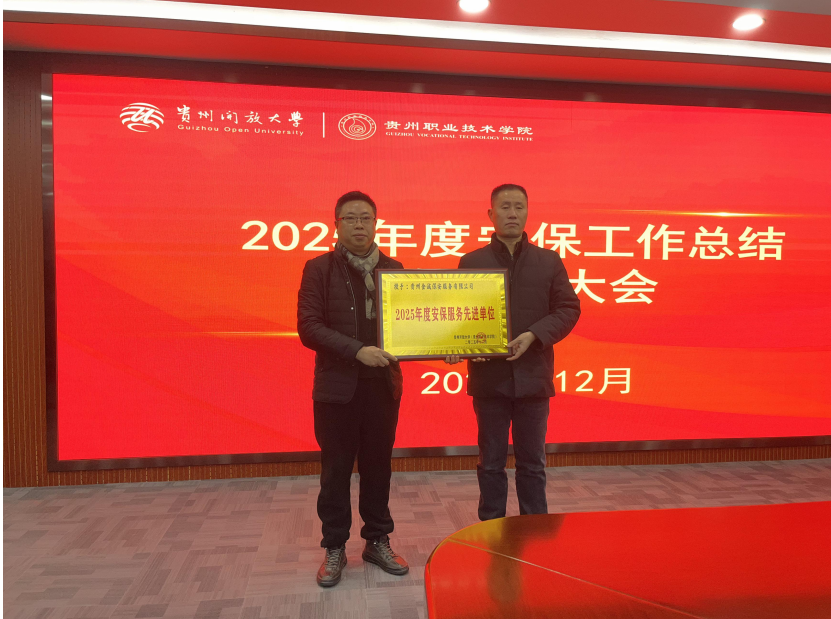 近日,贵州开放大学(贵州职业技术学院)隆重召开“2025 年度安保工作总结暨表彰大会”,会上,学校保卫部门为贵州金诚保安服务有限公司驻学校项目分别颁发了“2025 年度安保服务先进单位”、“优秀项目经理”、“最美安保员”等多项荣誉奖牌。