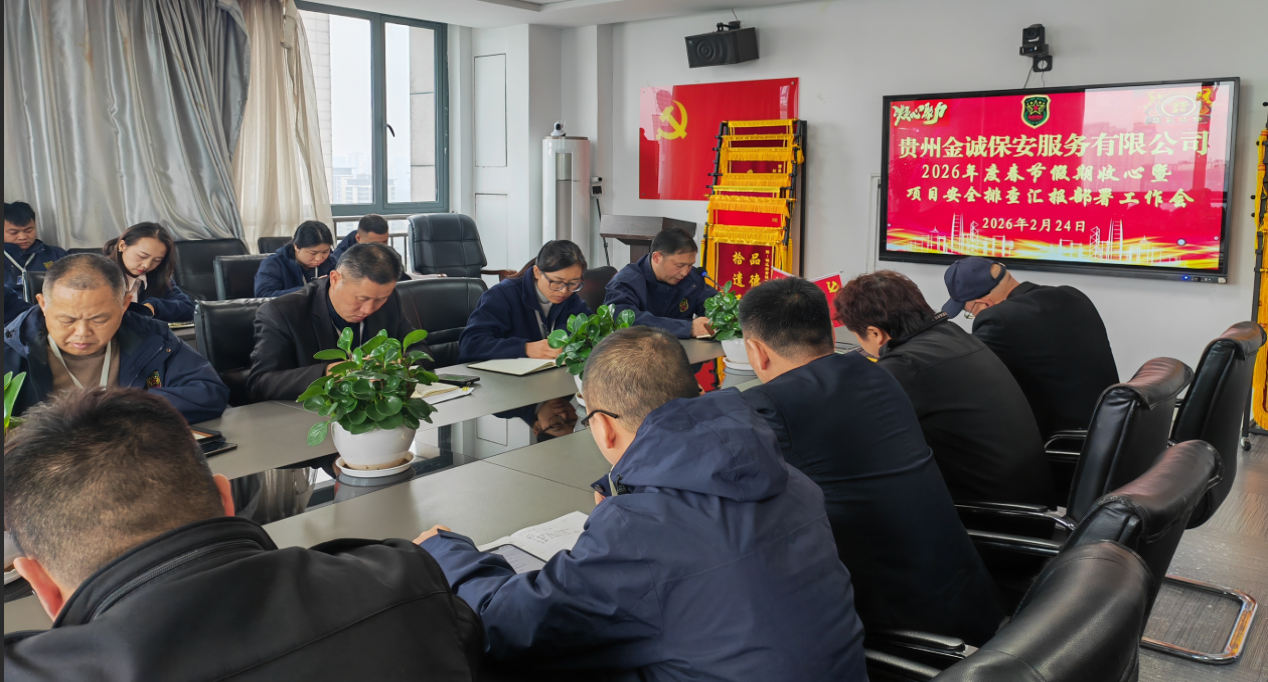 为切实做好春节期间安保维稳工作,确保节后队伍迅速归位、工作高效衔接,全面排查整治项目安全隐患,筑牢安全生产防线,公司于2月24日召开2026年度春节假期收心暨项目安全排查汇报部署工作会,总经理李凯主持会议并作工作部署,全体办公室人员及各项目负责人通过现场或钉钉视频会议形式参会。