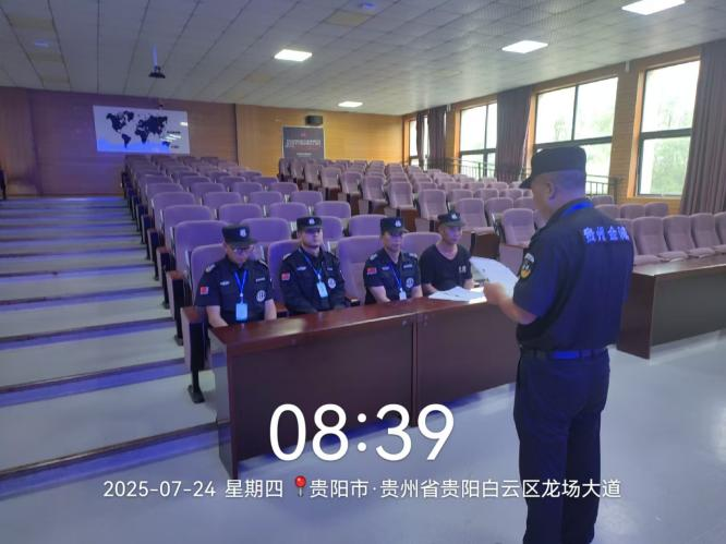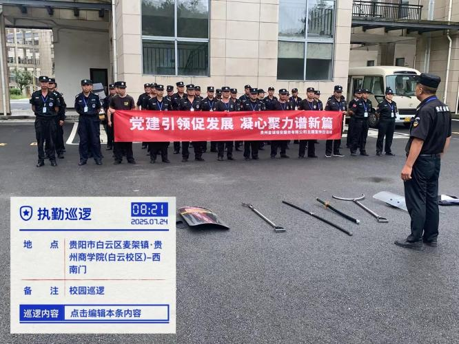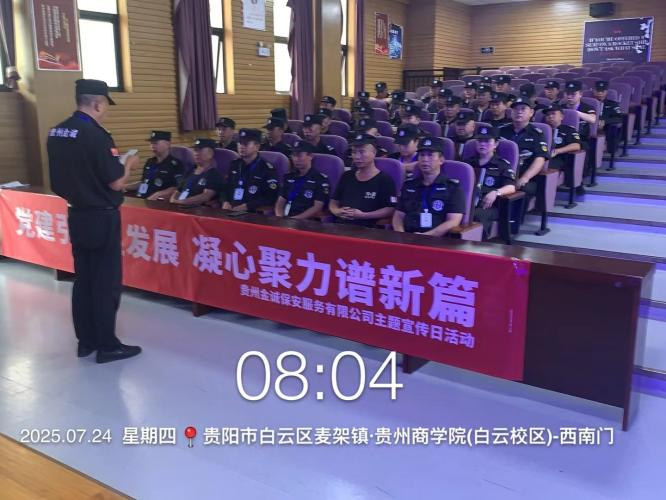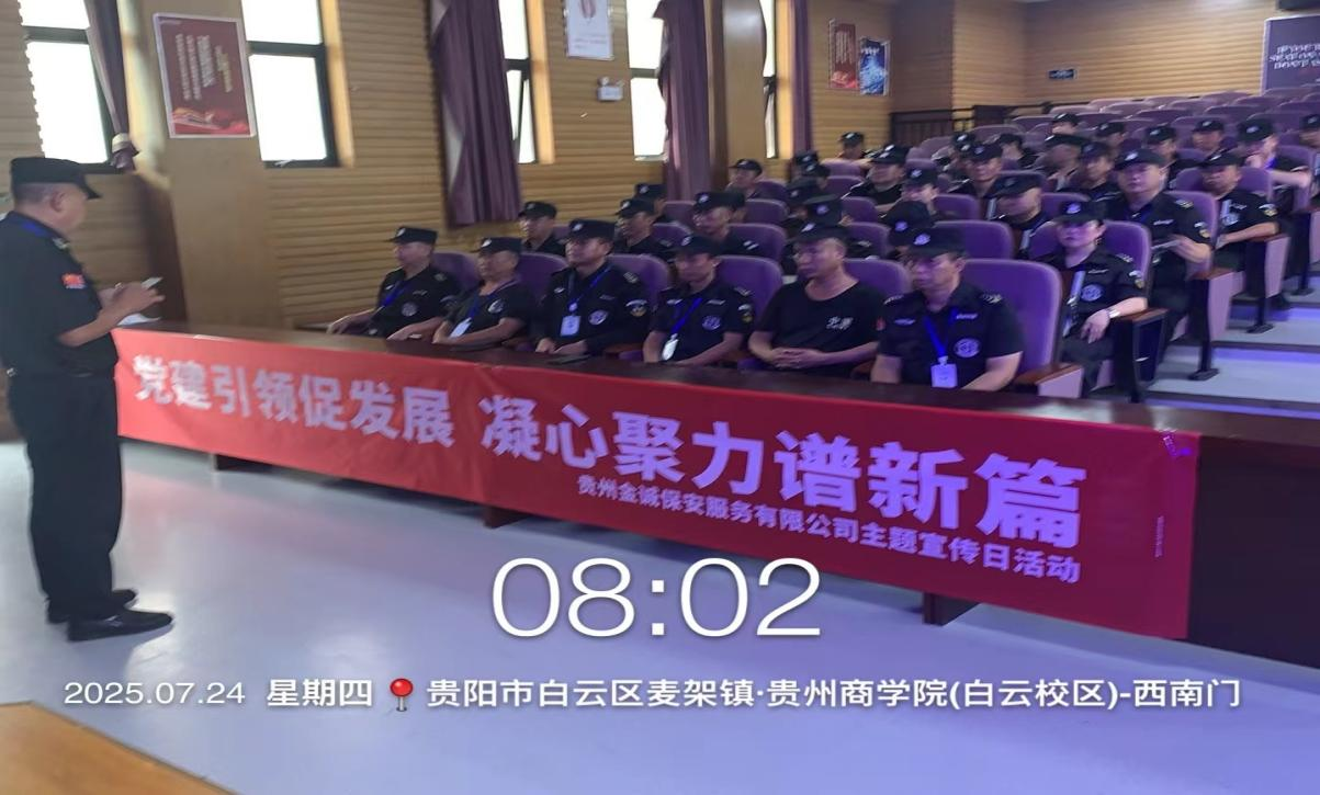 为深入贯彻党的二十大精神,强化党建引领保安服务队伍建设,积极响应贵州金诚保安服务有限公司关于保安宣传日活动的号召,贵州商学院保安项目部于2025年7月24日开展了以“党建引领促发展,凝心聚力谱新篇”为主题的保安宣传日活动,推动项目保安队伍在党建赋能、技能提升与人文关怀中迈上新台阶。