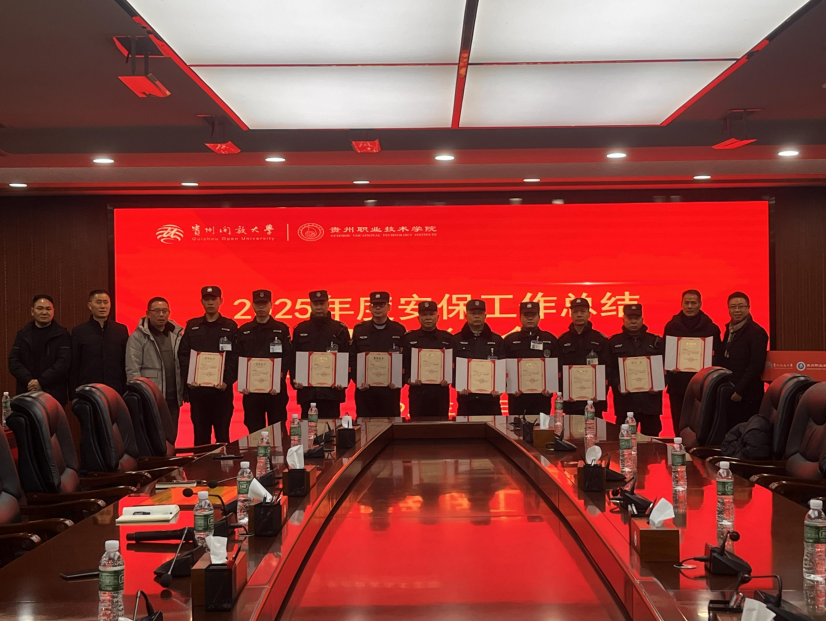 近日,贵州开放大学(贵州职业技术学院)隆重召开“2025 年度安保工作总结暨表彰大会”,会上,学校保卫部门为贵州金诚保安服务有限公司驻学校项目分别颁发了“2025 年度安保服务先进单位”、“优秀项目经理”、“最美安保员”等多项荣誉奖牌。